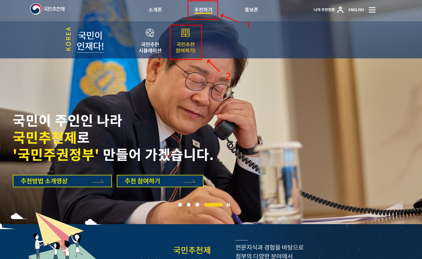 - ‘추천하기’ 메뉴‑’국민추천 참여’ 클릭