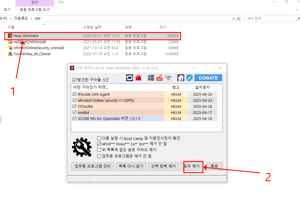 - HoaxEliminator.exe 파일 우클릭 → “관리자 권한으로 실행”